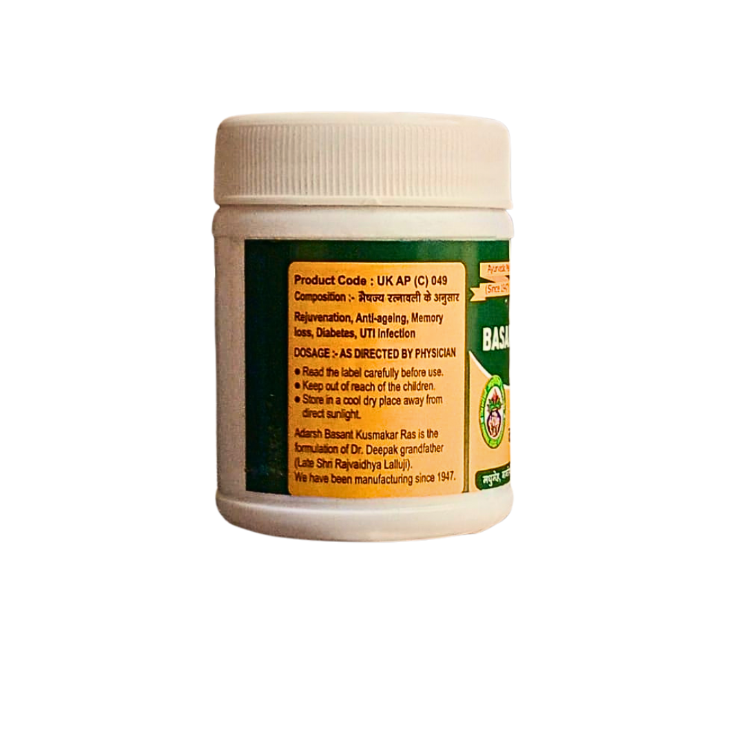 Basant Kusumakar Ras is believed to work by regulating blood sugar levels, improving digestion, and strengthening the immune system. It is also used to treat urinary tract infections, liver disorders, and pancreatitis. However, it is important to note that Basant Kusumakar Ras should only be taken under the guidance of a qualified Ayurvedic practitioner, as it may have some side effects and interactions with other medications.