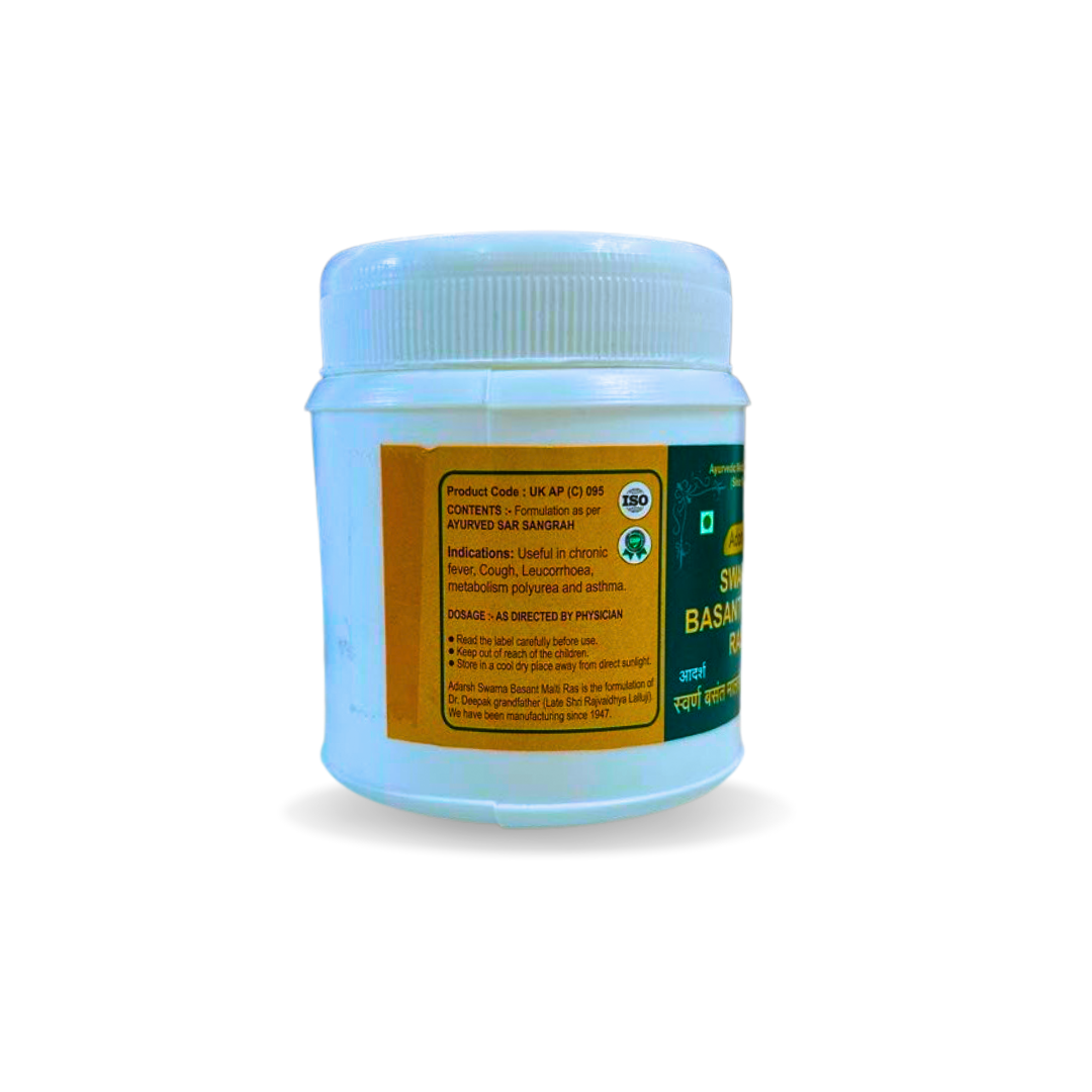 Basantmalati Ras (also spelled as Basant Malti Ras) is a traditional Ayurvedic medicine that is used for various health conditions, including respiratory disorders, fever, and skin disorders. It is typically made from a combination of minerals such as purified mercury, sulfur, and mica, along with herbs like triphala, giloy, and neem.